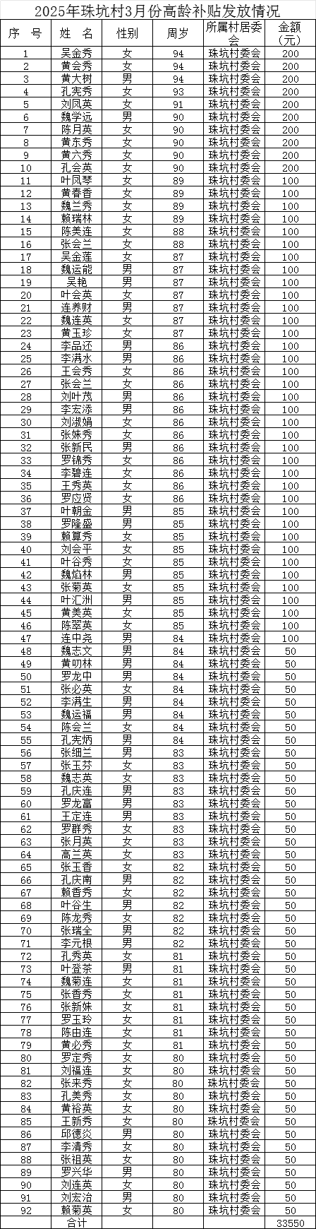 2025年珠坑村3月份高齡補貼發(fā)放情況