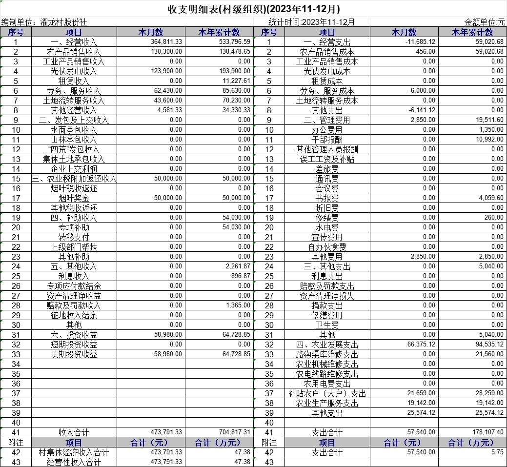 大由鄉(xiāng)濯龍村2023年11-12月收支明細(xì)