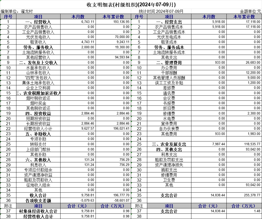 大由鄉(xiāng)濯龍村2024年7-9月收支明細(xì)