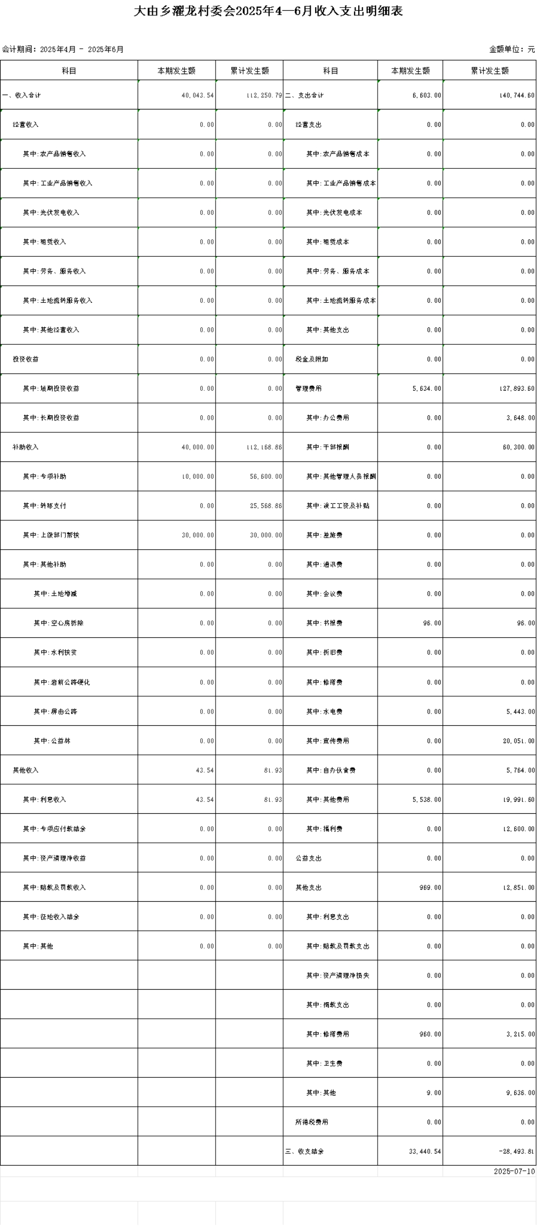 大由鄉(xiāng)濯龍村委會2025年4—6月收入支出明細表