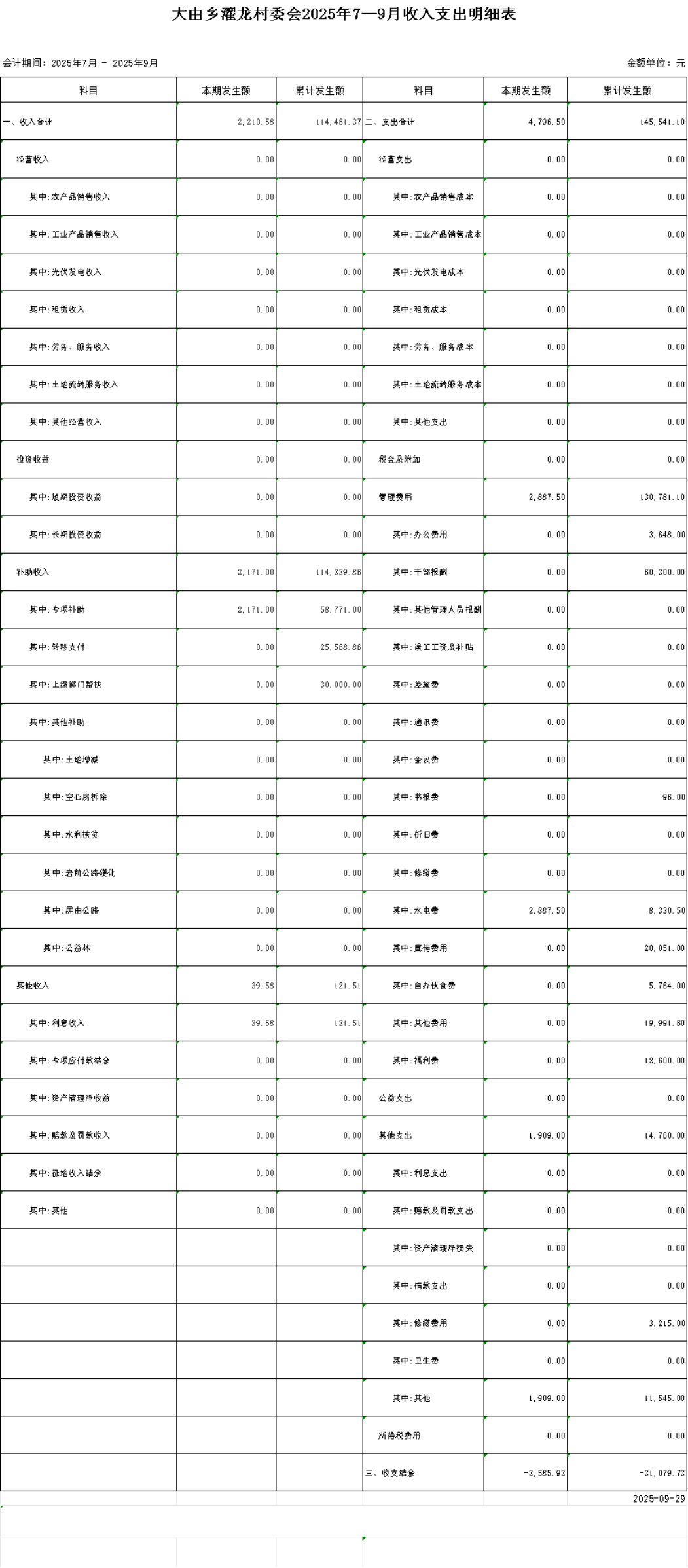 大由鄉(xiāng)濯龍村委會2025年7—9月收入支出明細表