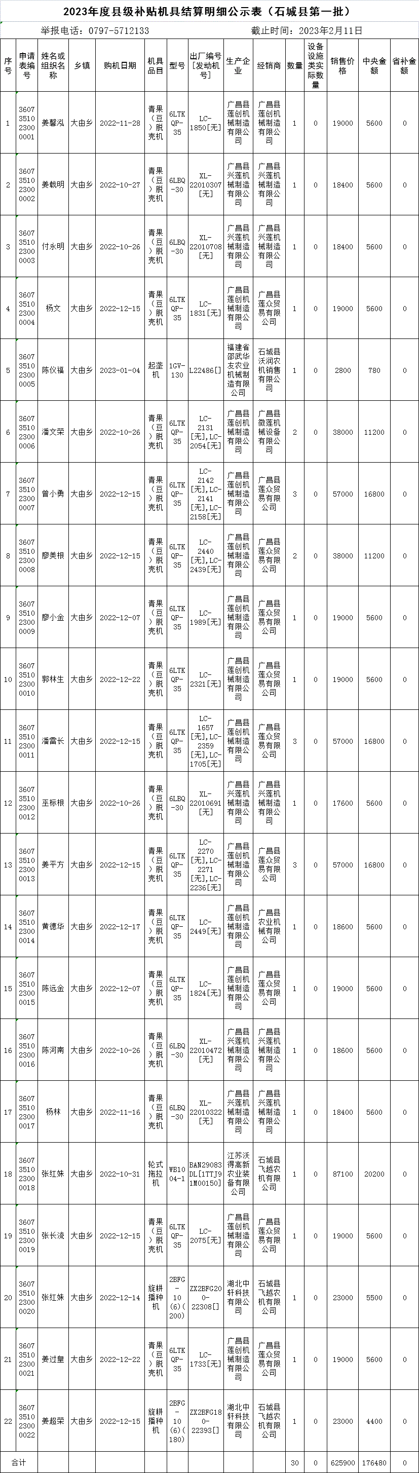 2023年度縣級補貼機具結(jié)算明細公示表(大由鄉(xiāng)第一批)