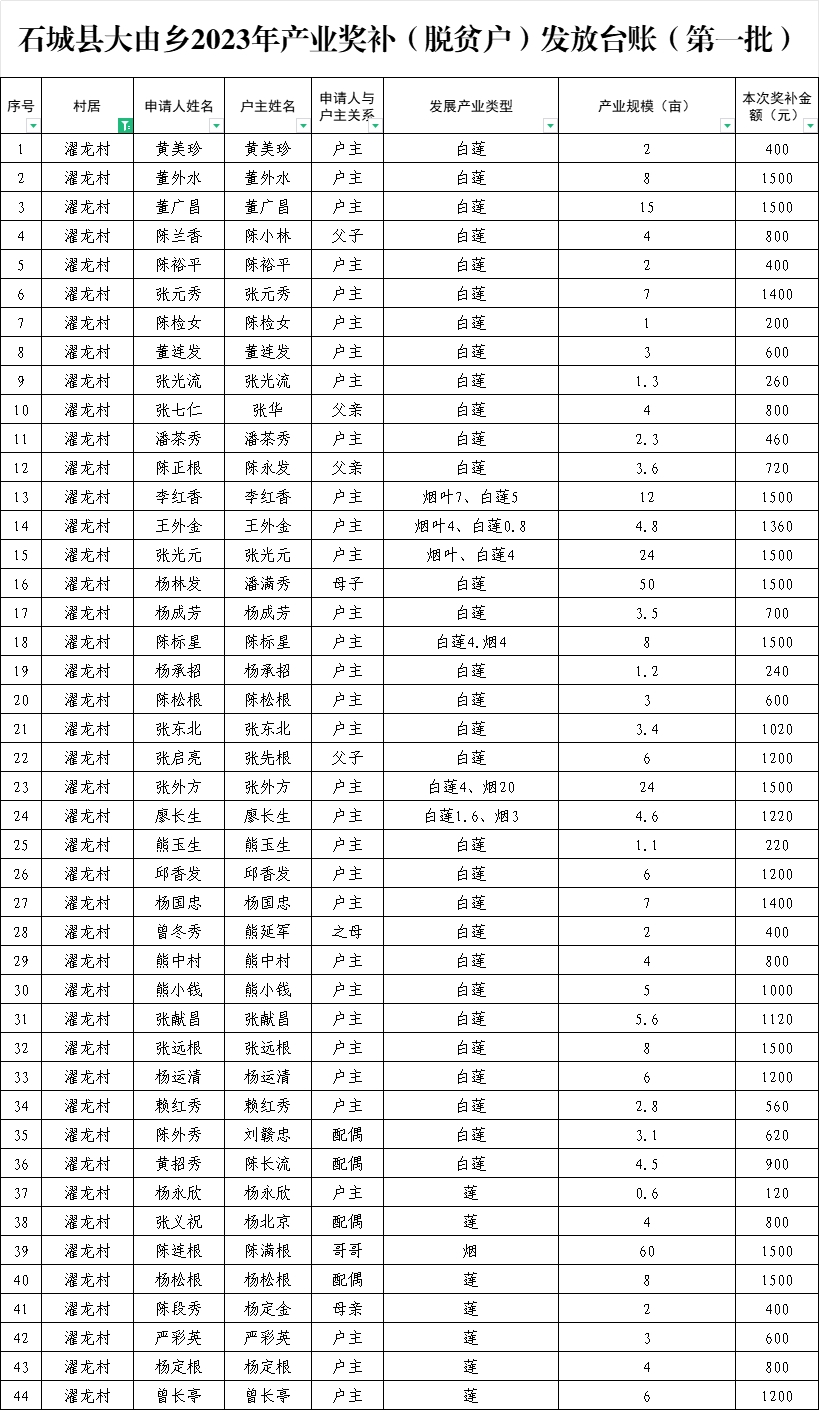 石城縣大由鄉(xiāng)濯龍村2023年產(chǎn)業(yè)獎(jiǎng)補(bǔ)(脫貧戶)發(fā)放臺賬(第一批)