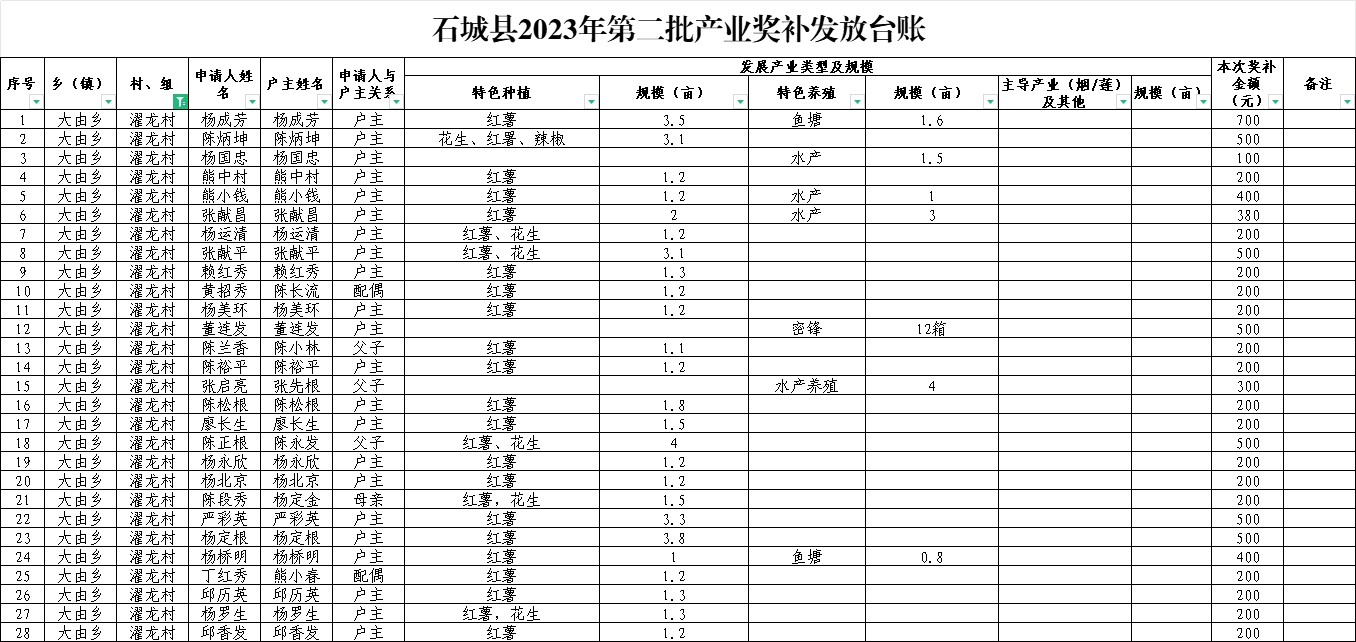 石城縣大由鄉(xiāng)濯龍村2023年第二批產(chǎn)業(yè)獎(jiǎng)補(bǔ)發(fā)放臺(tái)賬