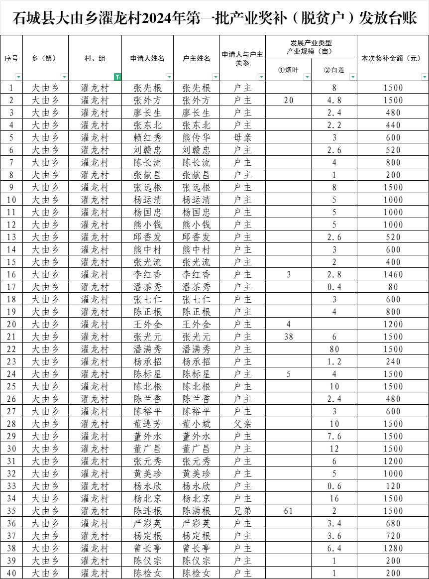 石城縣大由鄉(xiāng)濯龍村2024年第一批產(chǎn)業(yè)獎補(脫貧戶)發(fā)放臺賬