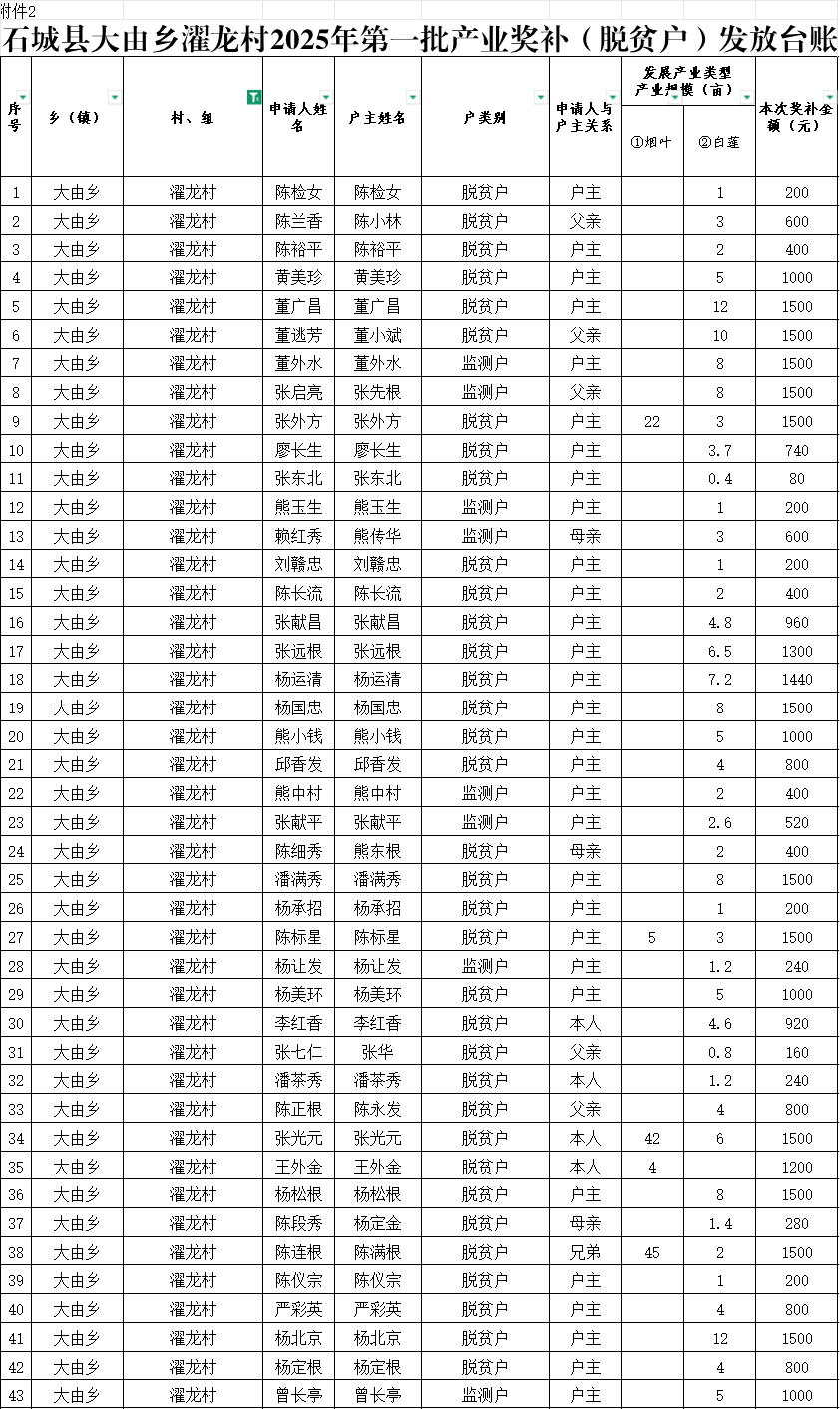 石城縣大由鄉(xiāng)濯龍村2025年第一批產(chǎn)業(yè)獎補(脫貧戶)發(fā)放臺賬