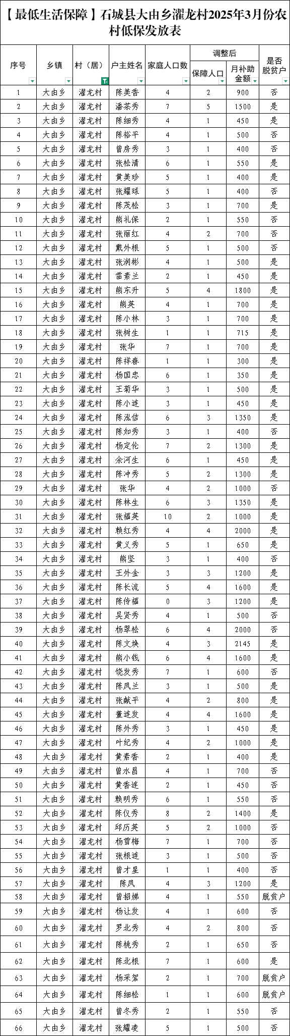 【最低生活保障】石城縣大由鄉(xiāng)濯龍村2025年3月份農(nóng)村低保發(fā)放表