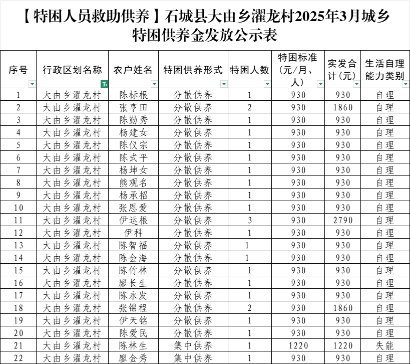 【特困人員救助供養(yǎng)】石城縣大由鄉(xiāng)濯龍村2025年3月城鄉(xiāng)特困供養(yǎng)金發(fā)放公示表