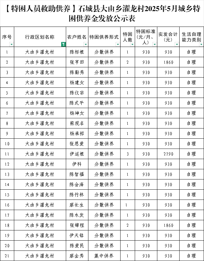 【特困人員救助供養(yǎng)】石城縣大由鄉(xiāng)濯龍村2025年5月城鄉(xiāng)特困供養(yǎng)金發(fā)放公示表