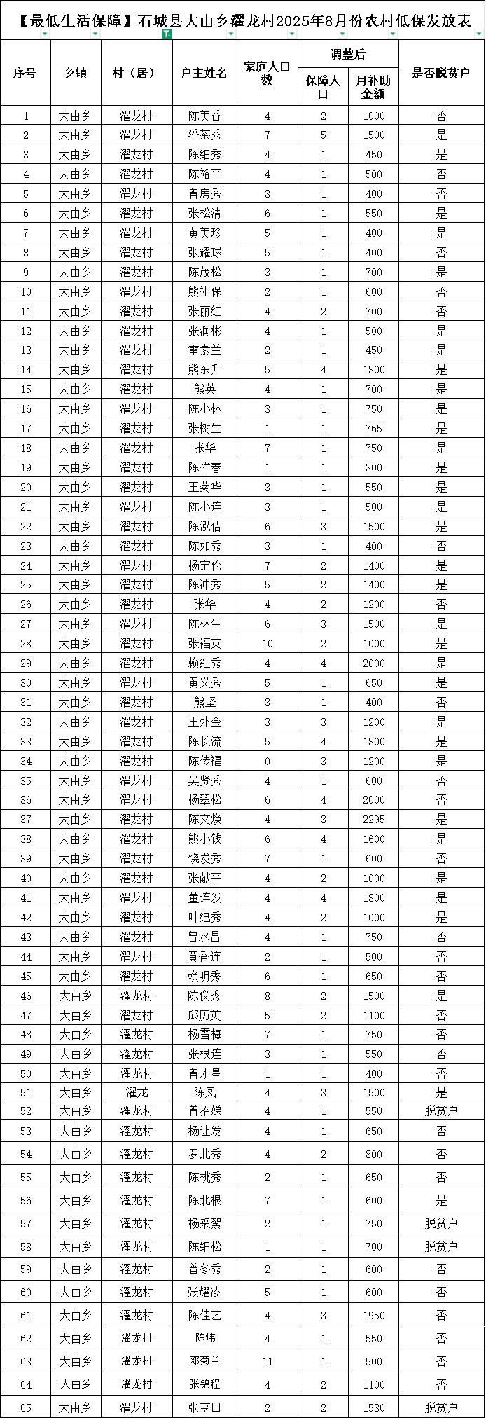 【最低生活保障】石城縣大由鄉(xiāng)濯龍村2025年8月份農(nóng)村低保發(fā)放表