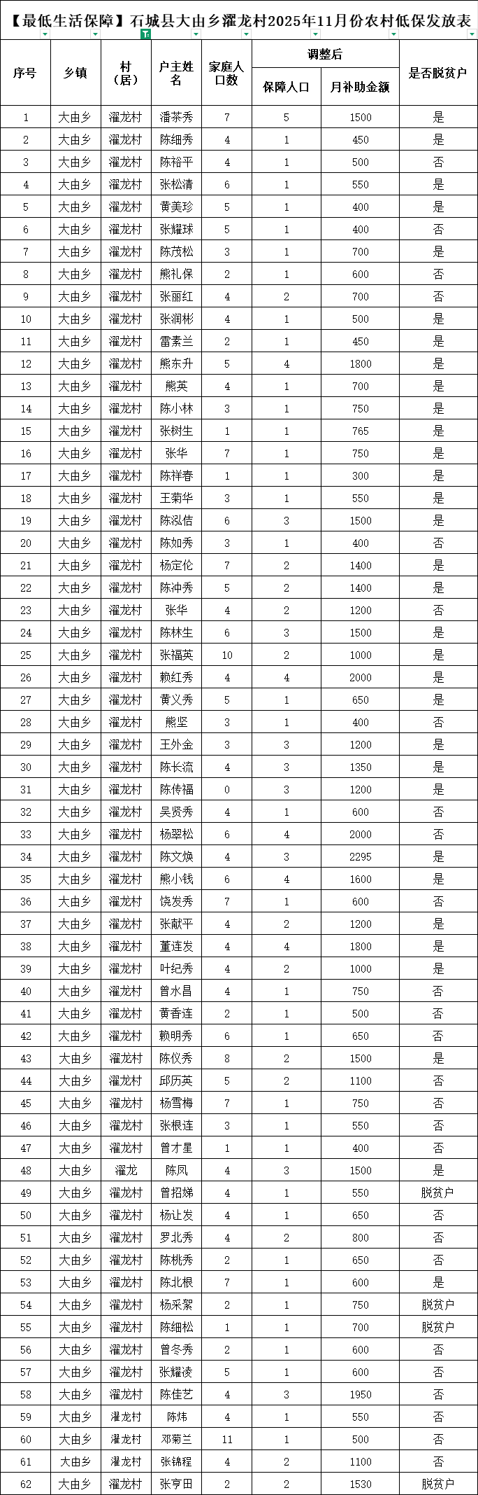 【最低生活保障】石城縣大由鄉(xiāng)濯龍村2025年11月份農(nóng)村低保發(fā)放表