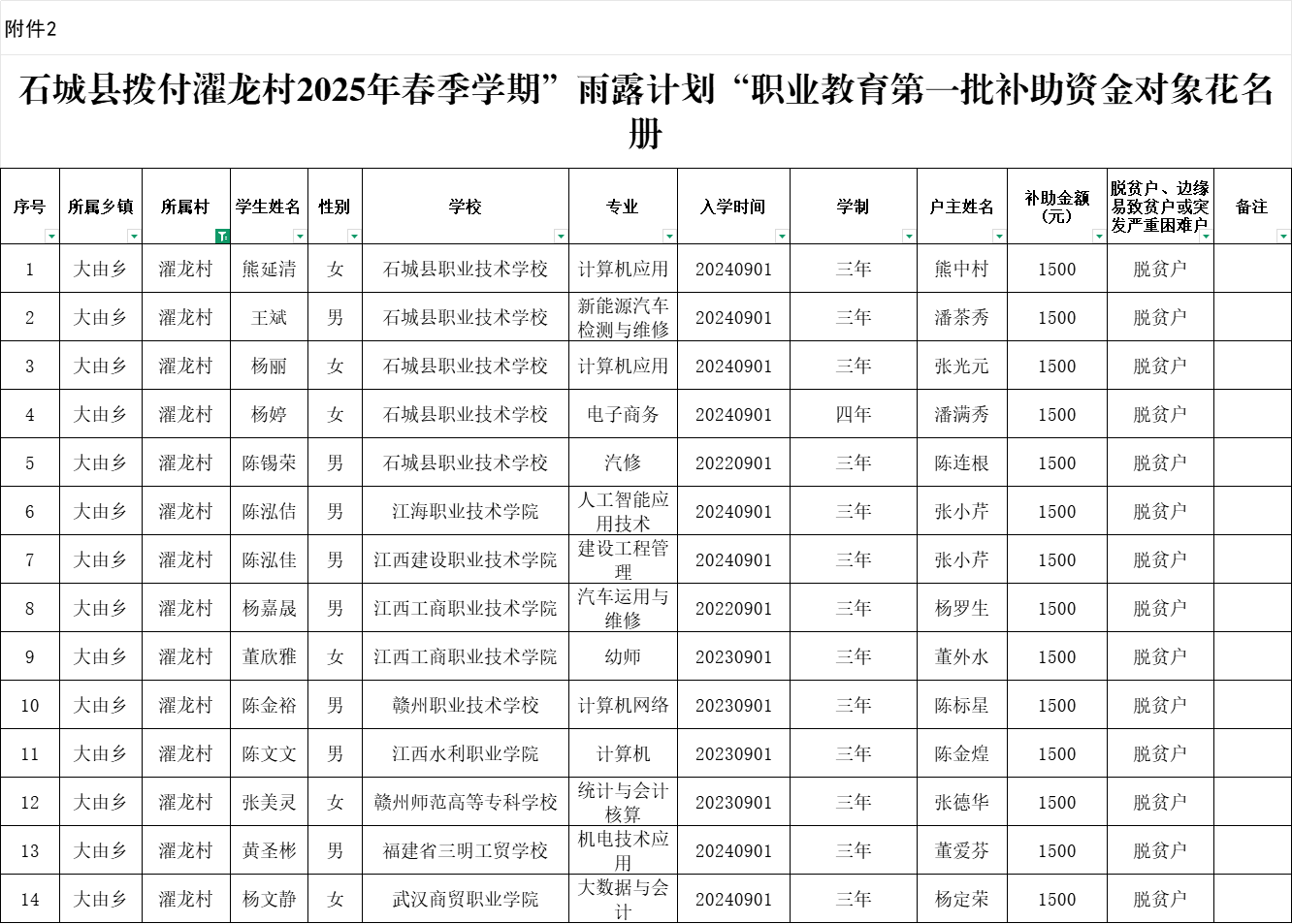 石城縣撥付濯龍村2025年春季學(xué)期”雨露計(jì)劃“職業(yè)教育第一批補(bǔ)助資金對象花名冊