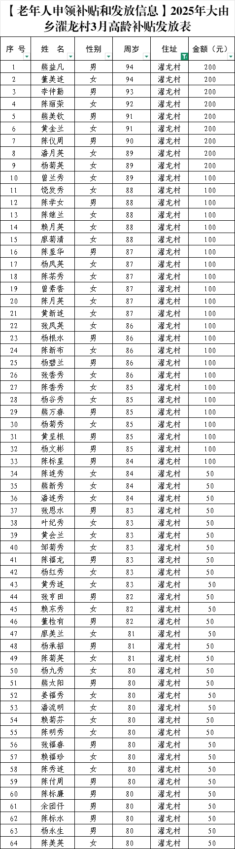 【老年人申領(lǐng)補(bǔ)貼和發(fā)放信息】2025年大由鄉(xiāng)濯龍村3月高齡補(bǔ)貼發(fā)放表