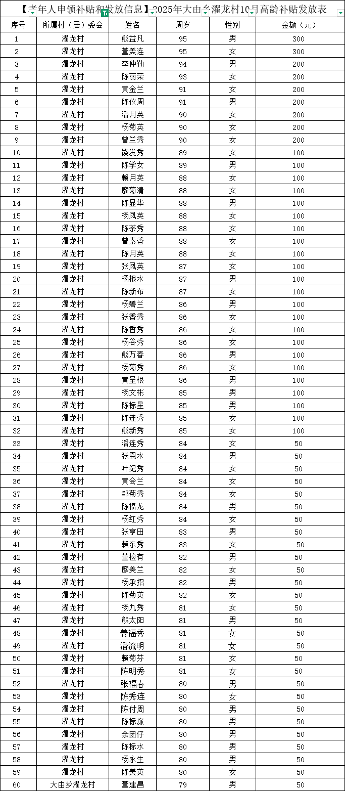 【老年人申領(lǐng)補貼和發(fā)放信息】2025年大由鄉(xiāng)濯龍村10月高齡補貼發(fā)放表