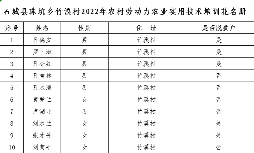 【產(chǎn)業(yè)扶持】石城縣珠坑鄉(xiāng)竹溪村2022年農(nóng)村勞動(dòng)力農(nóng)業(yè)實(shí)用技術(shù)培訓(xùn)花名冊