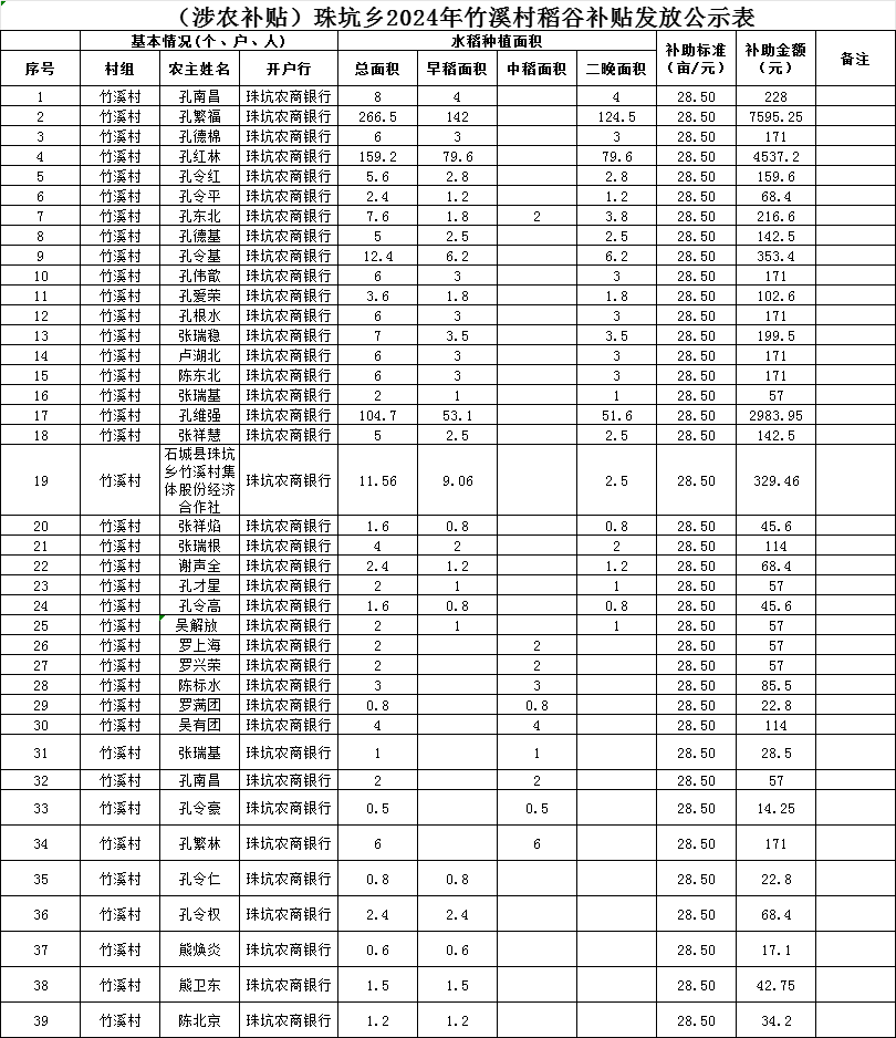 (涉農(nóng)補貼)珠坑鄉(xiāng)2024年竹溪村稻谷補貼發(fā)放公示表