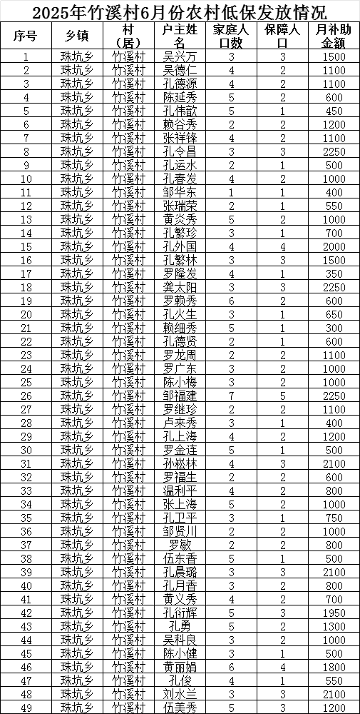 2025年竹溪村6月份農(nóng)村低保發(fā)放情況