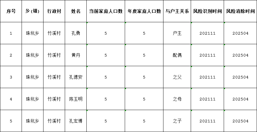 珠坑鄉(xiāng)竹溪村2025年1-5月消除監(jiān)測對象名單公示